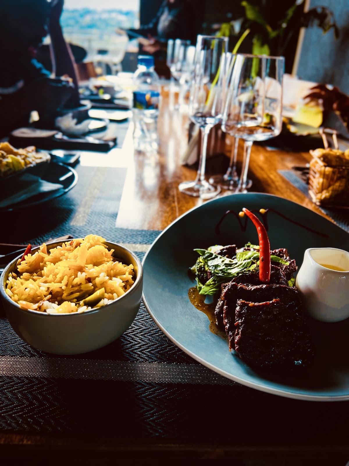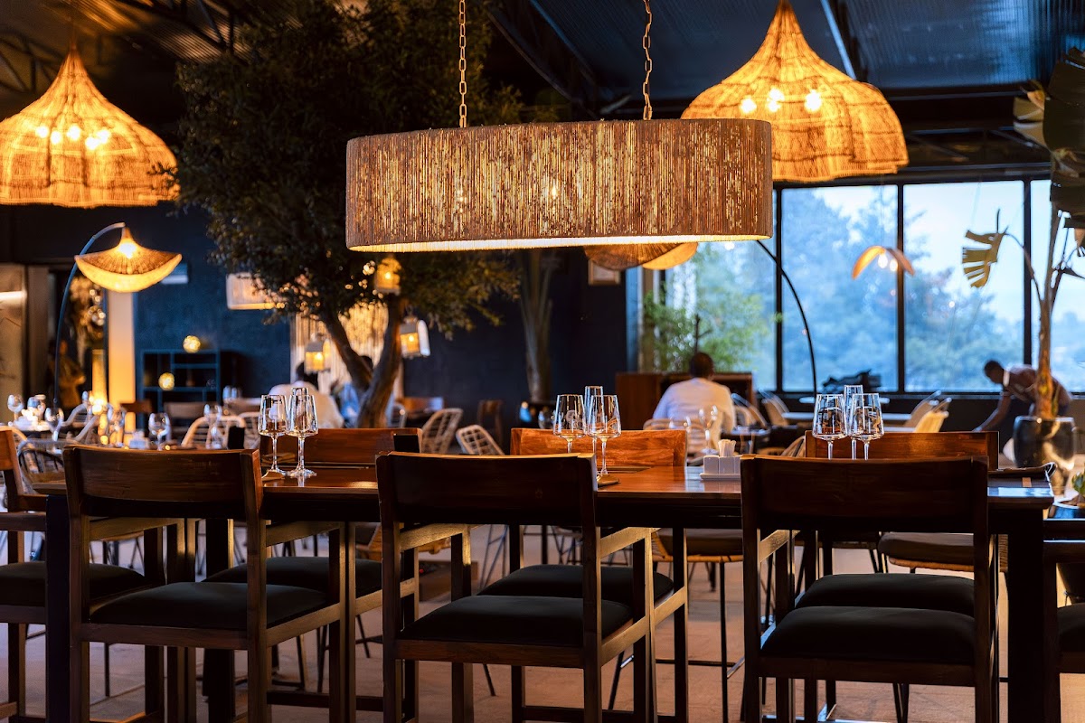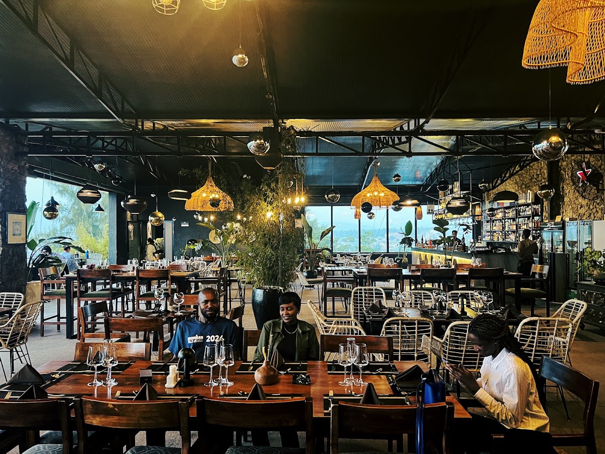 Boho Restaurant is an upscale neighborhood spot in Kimihurura that blends a terrace with broad views and a small downstairs tiki bar, creating a mix of relaxed daytime dining and later-night drinks. Guests consistently note the view from the terrace and a decorative pool feature, and the menu mixes African plates with familiar items like a creamy Carbonara Dough — pasta with pan-fried bacon in béchamel — along with a robust drink list: house cocktails such as Long Island iced teas and a much-praised espresso martini, layered non-alcoholic "rainbow" drinks with passion fruit and mango, and a compact tiki bar that plays good music.