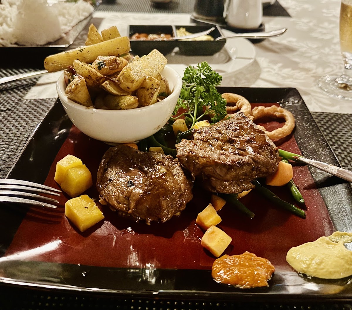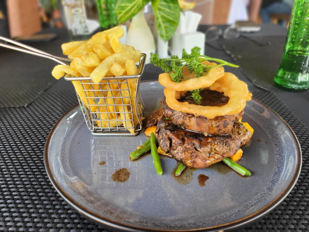The Bistro in Kigali is portrayed by customers as a roomy, open-air spot with a view and a broad, international menu that leans toward grilled and steak dishes. Diners frequently mention fillet mignon and sizzler specials, along with standout items like perfectly glazed goat ribs, a chocolate-covered steak, and a tom yum (tum yom) soup noted for being full of chicken. Coffee and desserts also get specific praise — several guests recommend the lava cake — which shows the menu ranges from casual drinks to rich after-dinner options.